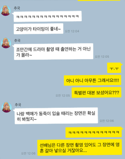 "ㅋㅋㅋㅋㅋㅋ얼굴은 왜 빨개졐ㅋㅋㅋㅋㅋㅋㅋㅋㅋㅋ진짜 네 역할은 표정연기 잘해야 할 수 있는 배역인듯ㅋㅋㅋㅋㅋㅋㅋ캬핰ㅋㅋㅋㅋㅋㅋ앜ㅋㅋㅋㅋㅋㅋ"-추국