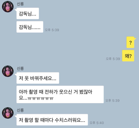 저 의상을 입는 날에는 항상 무릎까지 오는 겉옷을 입고 다니다 촬영이 시작해야만 벗고, 사람들이 당당하게 다니라고 놀리면 얼굴이 새빨개졌다.
