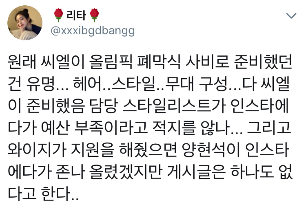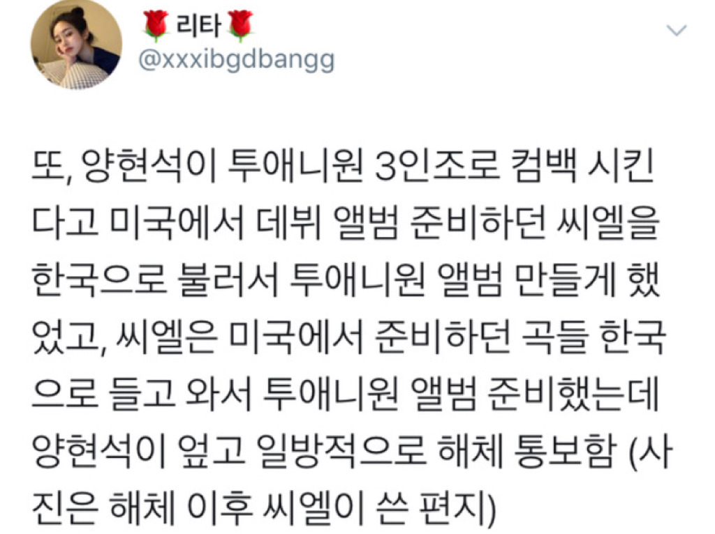 작성자겨자색가디건 작성시간 18.07.22 아니 양현석은 지가 잘해서 와지 잘나가는줄 아나봐 주제 좀 알고 아티스트들 좀 챙겨 빅뱅도 그렇고 씨엘도 그렇고 없었으면 지가 지금 그 자리에 있을거 같나