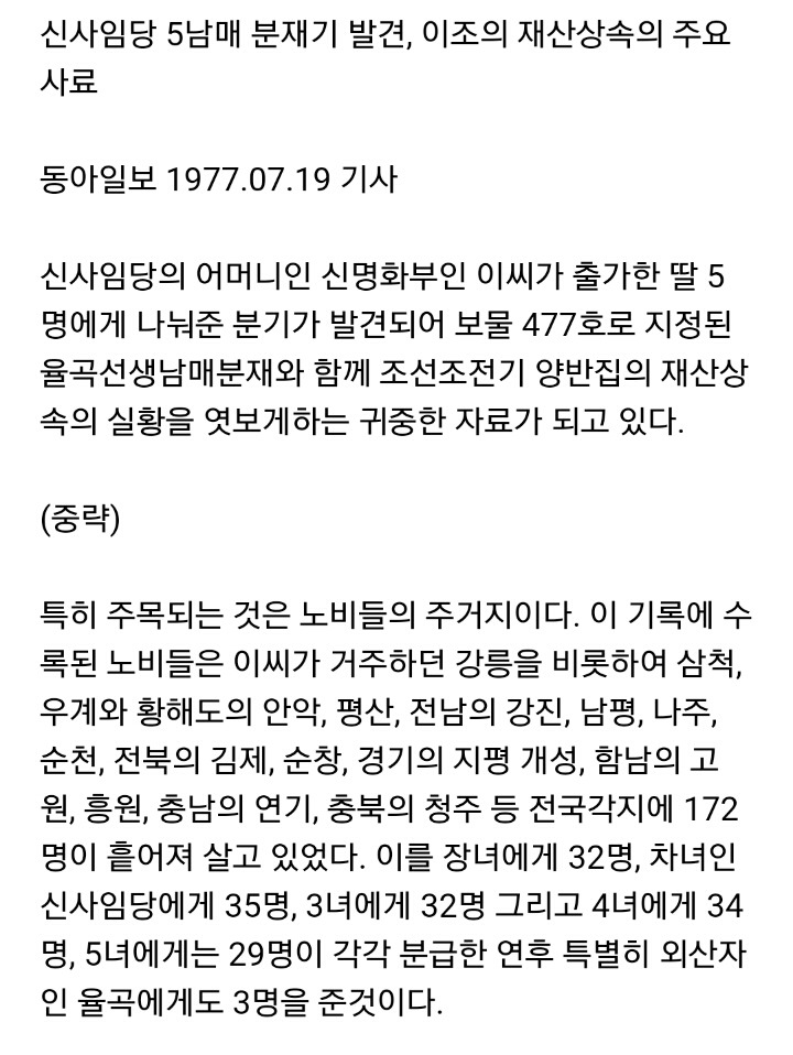 조선시대에 딸에게도 재산을 분배해준 상황을 엿볼수 있는 기록.