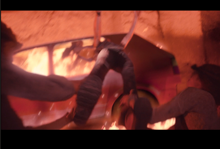 파피용이 끌려간 불타는 차가 찌그러집니다.