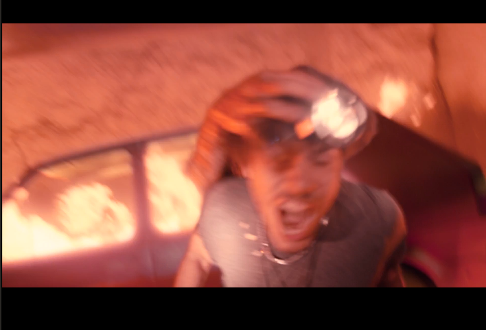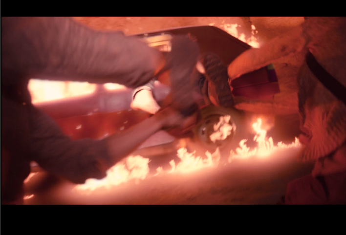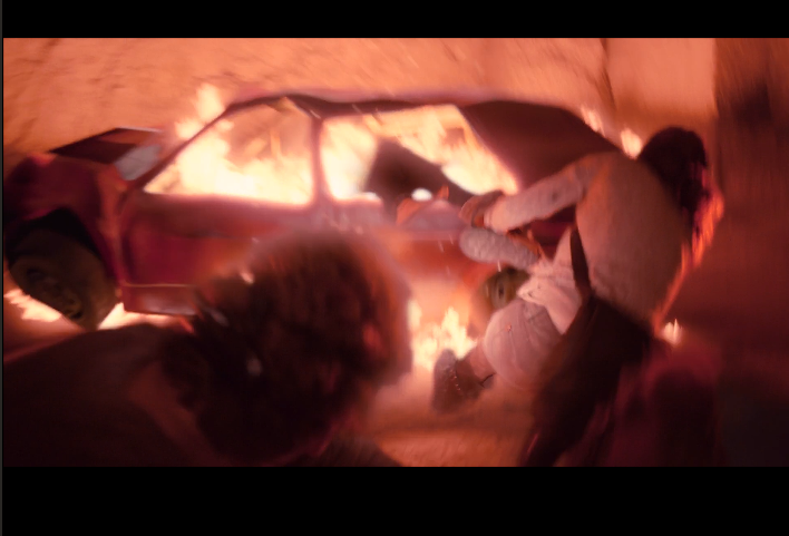 불타는 차에 있던 남자가 파피용의 허리춤을 잡습니다.