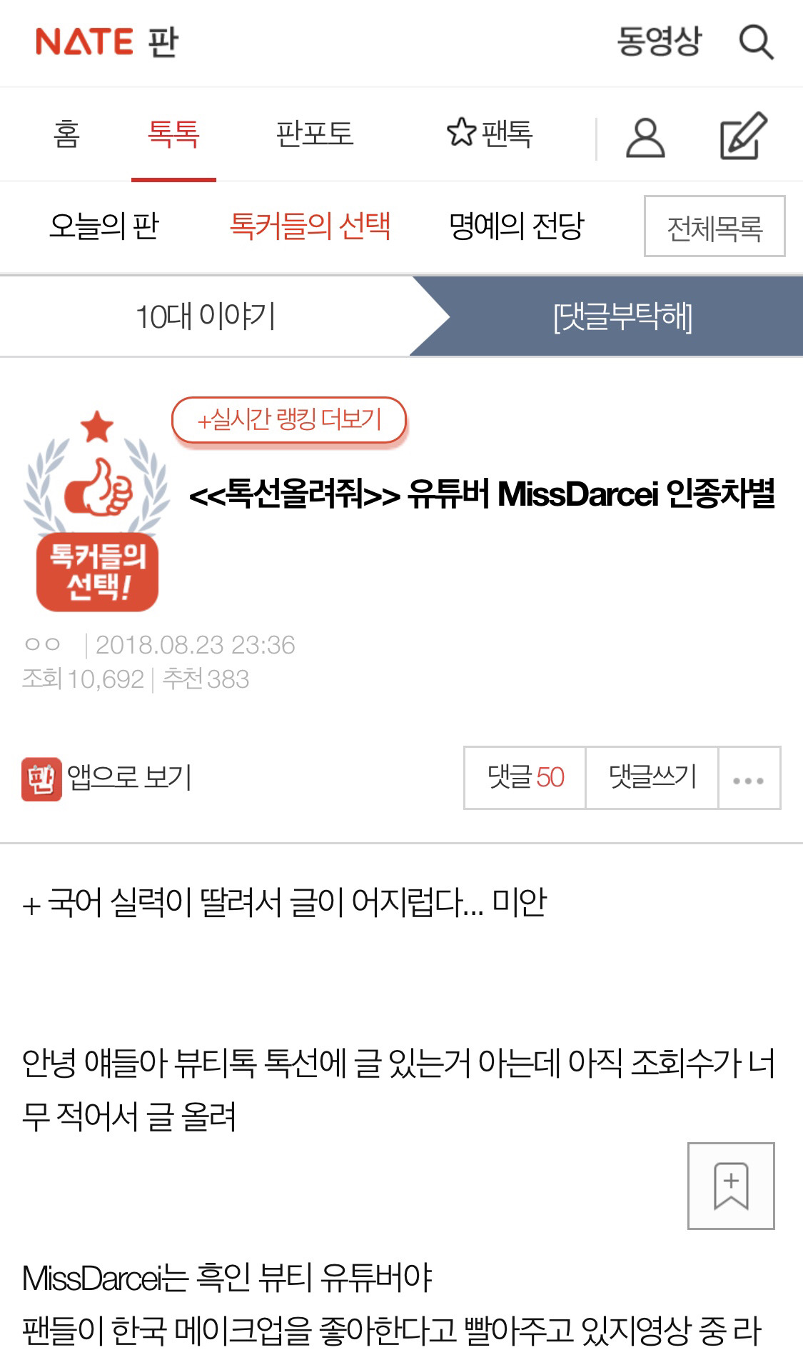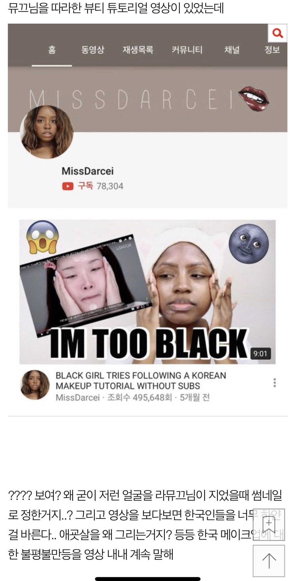 [스크랩] [기타]유투버 MissDarcei 인종차별 작성자참새는짹짹충|작성시간18.08.24|조회수9,335 목록 댓글 37 글자크기 작게가 글자크기 크게가 출처 : http://m.pann.nate.com/talk/343176729?currMenu=talker&order=REC&page=6신고하자 진짜 어이없어; 잘보면 포니도 조롱함 ㅋㅋ그 동영상 보면 ㄹㅇ 열받아 조롱쩔저 사람 주소야!https://www.youtube.com/user/MissDarcei 다음검색 스크랩 원문 : *여성시대* 차분한 20대들의 알흠다운 공간 현재 게시글 추가 기능 열기 북마크 공유하기 신고 센터로 신고 댓글 댓글 37 댓글쓰기 답글쓰기 댓글 리스트 작성자유정연에 인생배팅 아무도 못막아 | 작성시간 18.08.24 미.개.해 작성자난 나만의 beauty | 작성시간 18.08.24 진짜 개짜증나 작성자막국수존맛대존맛 | 작성시간 18.08.24 첨본다 ㄹㅇ 개듣보잡 작성자|ㅇㅅㅇa | 작성시간 18.08.24 ??아니 무작정 흰걸 바르는게 아니라 피부가 하야니까 그거에 맞춰 바른거지;; 얘 진짜 열폭 왜이래?억하심정있나 작성자느갭이느갭이 | 작성시간 18.09.02 존나 코리안푸드 코리안패션 이지랄하는데 왜 인종차별하는겨 ㅅㅂ 댓글 전체보기