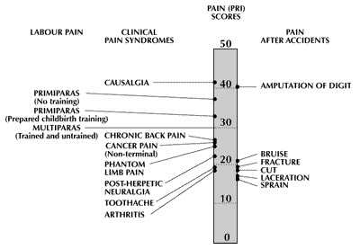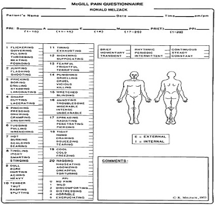 McGill대학의 Melzack과 Torgerson이 1971년에 고안한 것으로 통증이 사회적 심리적으로 복잡한 요인이 있기 때문에 한 가지 척도로만 평가할 수 없음을 간과하고 감각구분영역 (sensory-discrimination dimension), 동기 유발감정영역 (motivational-affective dimension), 인식평가영역 (cognitive eval!!!!uation dimension)에 따라 통증에 관한 어휘를 제시하고 환자가 느끼고 있는 통증에 대해 적절한 어휘를 선택하도록 하여 통증의 강도를 서열 척도화한 맥길통증어휘표(MPQWL)를 고안하여 통증 평가 방법으로 사용하였다. 20종의 통증어휘군중에서 선택하는 어휘수(Pain Rating Index) 선택된 어휘수 및 현재통증강도 (present pain intensity, PPI)로 통증을 분석하여 통증감지지수를 백분율로 계산하여 통증감소 정도를 평가한다.