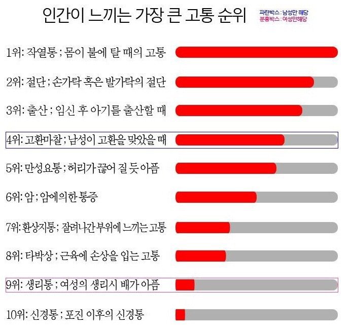 1위(42점). CAUSALGIA : 작열통(灼熱痛). 라틴어로 '불타는 통증' 이라는 뜻, McGill Pain Index 에서는 CRPS - RSD(Complex Regional Pain Syndrome:복합부위통증증후군 - Reflex Sympathetic Dystrophy:외상후 반사성 교감신경 이영양증)를 나타낸다. 어느 부위를 다쳤을 때, 해당 부위가 아닌 다른 부위에서 나타나는 고통; 아직 원인을 알 수 없으며, 진통제 처방외의 다른 치료법도 딱히 없다.