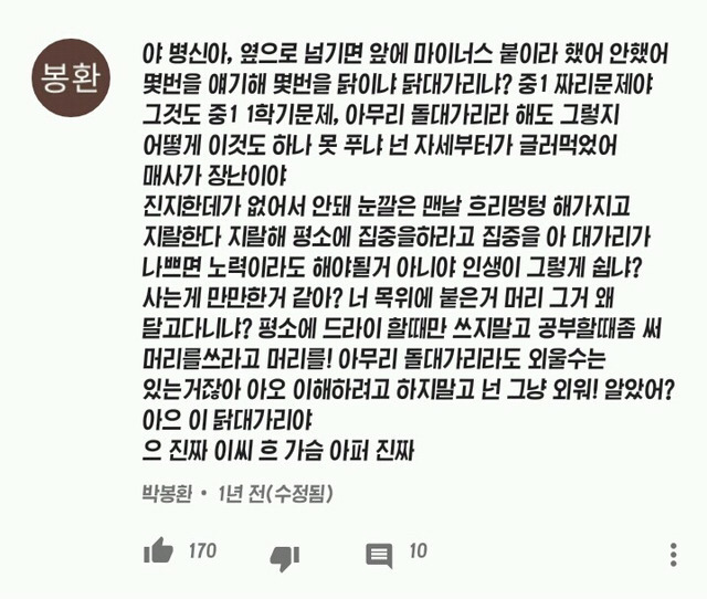 작성자나의 드립력은 아무말 대잔치 작성시간 18.09.07 나도 내동생 가르치다가 개빡쳐서 이틀만에 쫑남