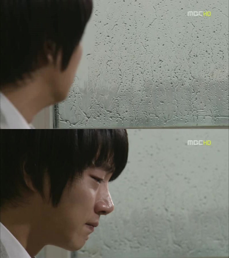 비가 와서 아무것도 보이지않는 창밖을 바라보며 울고있는 준혁..