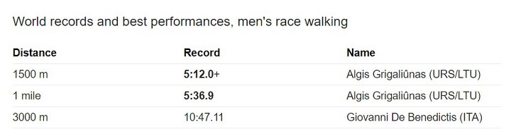 육상 중장거리와 똑같은 거리로 측정한 경보 세계기록들은