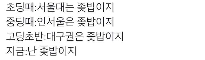 작성자Han tae joo 작성시간 18.10.03 어찌저찌 왔는데 중딩때 서울대 갈수 있을줄 알았다 쉬발ㅋㅋㅋ