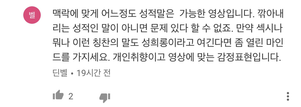 위 유튜버에게 '자지 물리고 싶다' , 'ㅗㅜㅑ 오늘은 이거다' 등 엄청난 성희롱 댓글들이 달렸었음 그런 성희롱 댓글들은 다행히 현재 신고당해 전부 내려갔지만 내려가기전엔 더한 댓글들도 엄청나게 달렸음