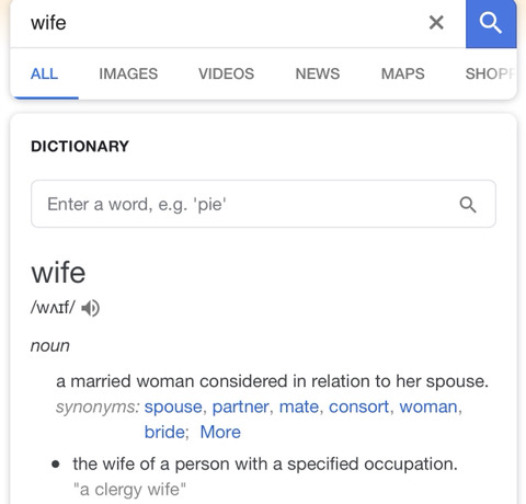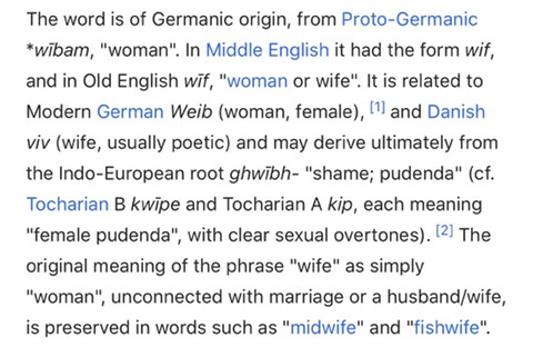 아마 wife 라는 단어는 게르만어에서 나온것으로 보이고 중세영어와 옛 영어에서도 한적을 찾아볼수 있음. 주로 여성 한명 혹은 아내라는 의미로 쓰임