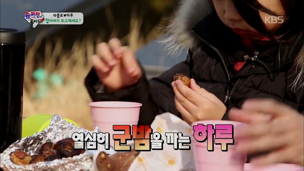 군밤을 열심히 까더니 하늘을 향해 손을 뻗는 하루