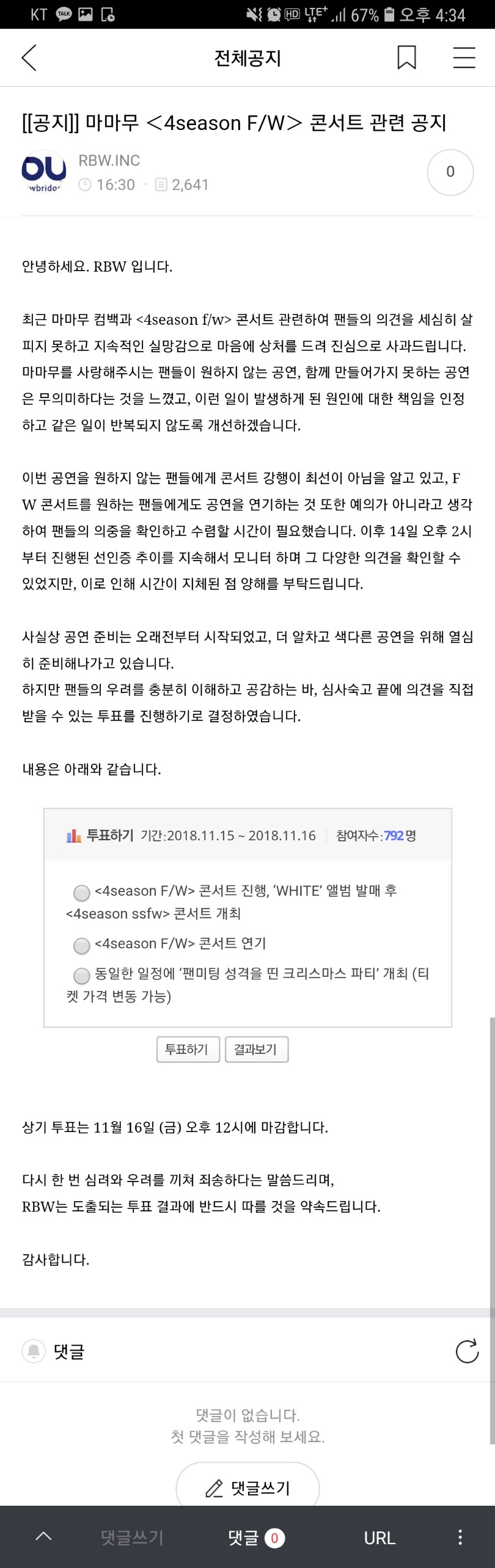 [기타]방금 전 올라온 마마무 소속사 공지 (보이콧 성공함) 작성자알비덥정신차려|작성시간18.11.15|조회수99,508 목록 댓글 75 글자크기 작게가 글자크기 크게가 http://m.cafe.daum.net/ok1221/9Zdf/1387406?svc=cafeapp상황설명 참고☝☝으아아아아아 이겼다아아아아악그와중에 투표하는거 진짜 구차하다..;문제시 수정 다음검색 현재 게시글 추가 기능 열기 북마크 공유하기 신고 센터로 신고 댓글 댓글 75 댓글쓰기 답글쓰기 댓글 리스트 작성자(Ma)2MO2 | 작성시간 18.11.15 아 진짜 무무들 최고다ㅜㅠ 작성자나를 허락해 줘요 | 작성시간 18.11.15 팬들 진짜 존나 멋있다 ㅠㅠ 고생했어 토닥토닥 작성자백현 경수 | 작성시간 18.11.15 고생했다 진짜로 ㅠㅠㅠㅠㅠㅠ 작성자4season | 작성시간 18.11.15 우리무무들 너무 수고했어요ㅠㅜㅜㅜ 작성자Conanti Dabitur | 작성시간 18.11.15 진짜 멋있다 댓글 전체보기