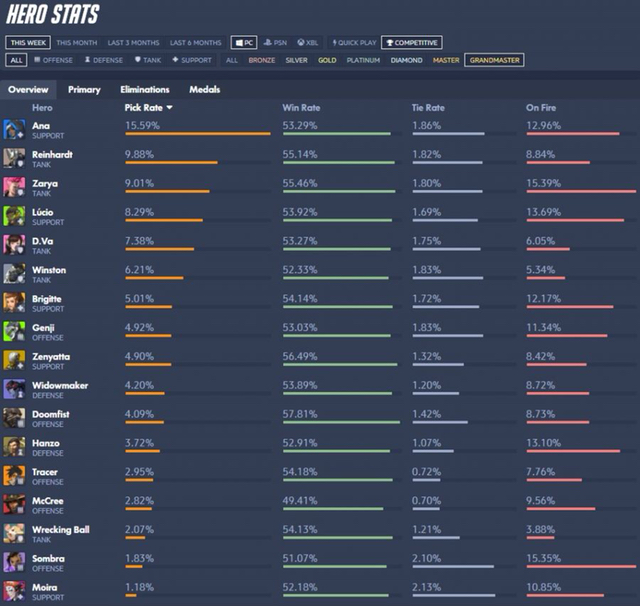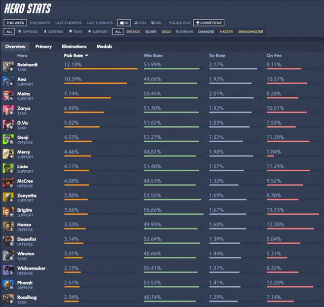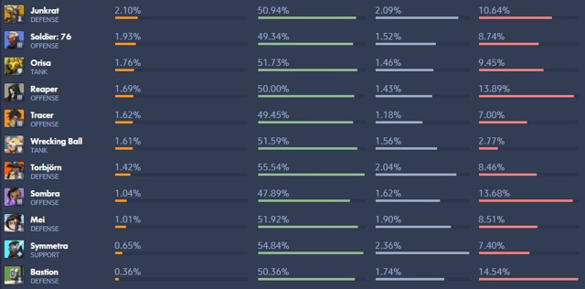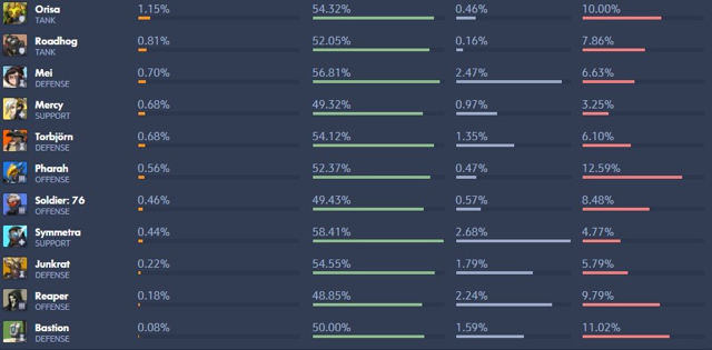 상위권에 있는 모이라와 메르시 픽률이 확낮아짐