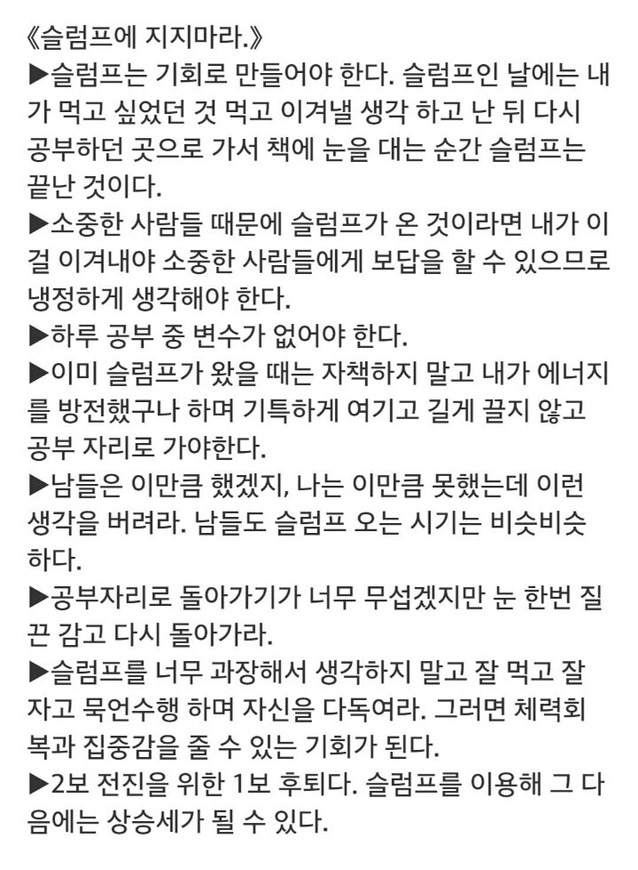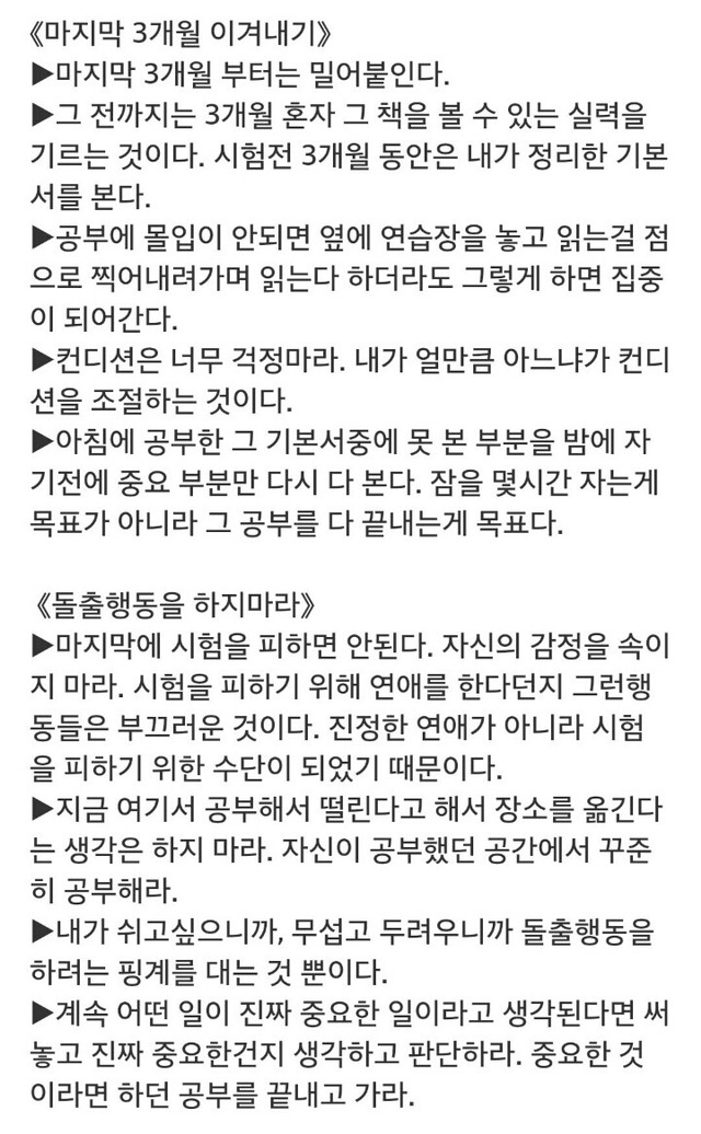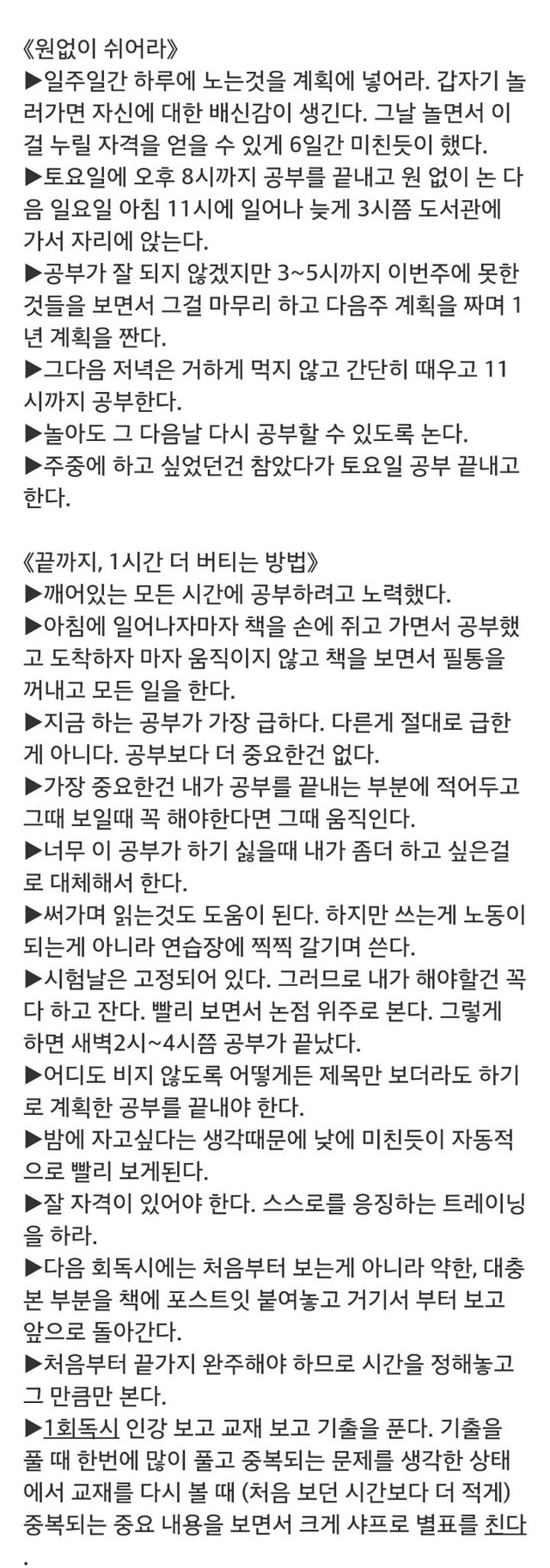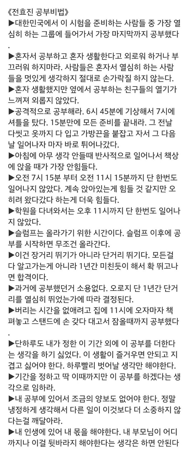 작성자쿠헬헬헬 작성시간 19.01.11 저렇게 6개월하고 했는데 몸 망가지고 정신 망가지고 삶이 피폐해졌음. 정말 나만 생각하고 독하게 했는데 나는 못하겠더라. 세상을 그렇게 삐딱하게 바라봤던 적이 없던 것 같음. 죽고싶었음. 그런 의미에서 전효진만 할 수 있는 공부법이라는게 맞는 말 같음ㅋㅋㅋ 저게 백프로 옳다고 생각하지 않음. 정말 케바케인듯...그래도 해보고 배운 건 많았다