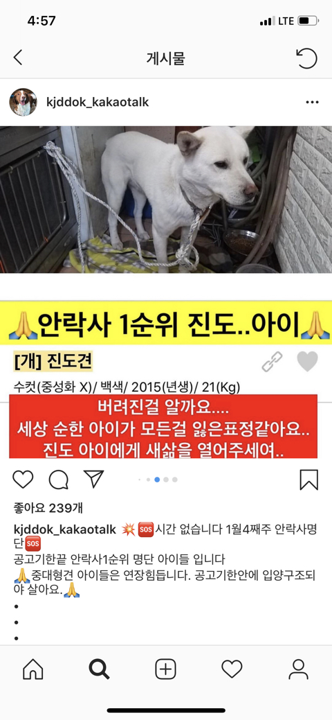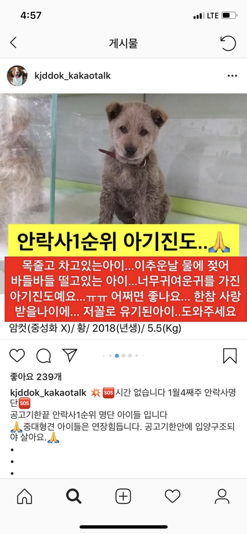 저번주 안락사 명단이었던 순돌이,누렁이,애기투,부대진도 전부 안락사됐어.. 이제 산지 일년채 넘은 애기들이었는데ㅠㅠㅠ 뼈 부러졌는데도 임보처도 없어 치료도 못받은채 죽었어.. 제발 이런일 없도록 공유라도 도와주라