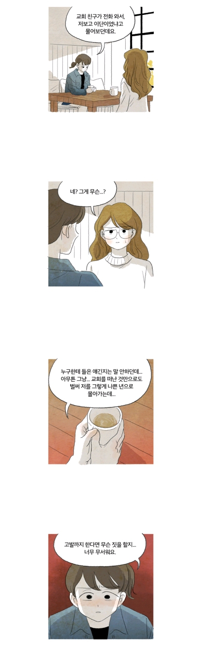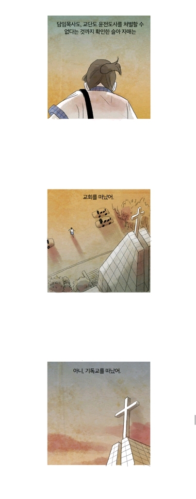 사진에 써 있는 내용대로 교회에서 여성들이 겪었던 성차별, 성폭행 등에 대한 이야기가 담겨져 있어 나는 무교라서 교회에 대해 잘 몰랐는데 이 웹툰을 통해 교회 안에서도 이러한 일들이 자주 일어나며 심지어 처벌 조차 받지 않는 사실에 화가 나서 이것을 많은 사람들이 봤으면 해서 글을 쓴다