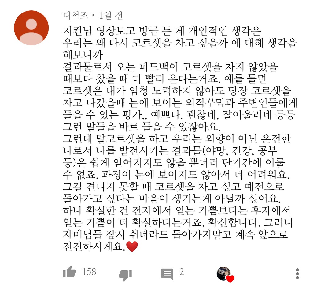 작성자어떨까 넌 작성시간 19.04.10 너무 눈물난다... 코르셋 다시 입고 싶은 스스로에게서 오는 자괴감이나 죄책감.. 자기검열 장난 아니야 진짜.. 여자만 힘들다는 생각을 벗을 수가 없어 너무 힘들어