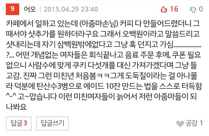 작성자홍종현(24세) 작성시간 15.05.01 나 카페알바 4개월동안 하면서 느낀점...진상 80퍼는ㅓ애있는 아줌마...진심...젊은사람들은 오히려 진상덜부림 나 아줌마 노이로제걸릴뻔;;