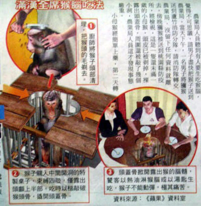 그리고 원숭이 뇌 이것도 지금 중국사람들 안먹고 서양놈들이 중국와서 호기심이으로 먹거나 지들 미식가인 척하면서 먹는데