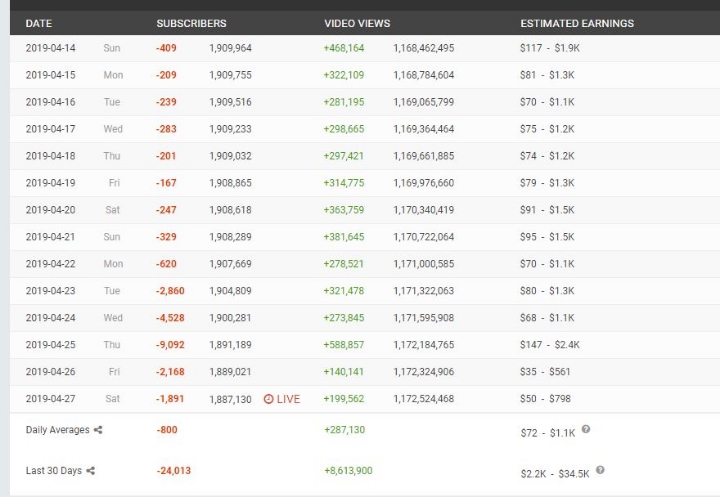 윰댕 - 먹방으로 전환한다고 하기 전부터 꾸준한 감소