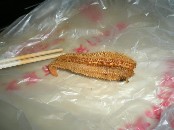 맛평가: 씹으면 입속에서 촉수들이 터진다, 바로 토나오는 맛이다 등 루머가 많았던 불가사리입니다. 실상은 그런 것 전혀 없고, 매우 먹을만 합니다! 겉표면의 돌기 부분은 쥐포 가장자리의 탄 부분같은 맛이고, 새까만 속살은 고등어조림 양념에 푹 재워둔 맛입니다. 다만 고등어조림에 비해 매우 비리고 많이 먹으면 느끼합니다. 사진의 불가사리는 다리 하나가 없는데.. 숙소 돌아오면서 배고파서 하나 먹었습니다(...). 그냥 먹기는 너무 크므로 다리 하나씩 잘라내서 먹는 것을 추천합니다. 손으로 잡아뜯어야 돌기가 바스러지지 않습니다.