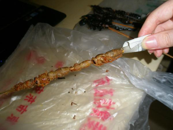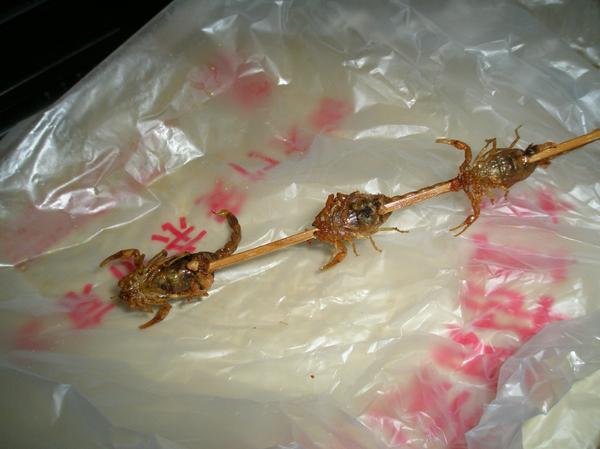 맛평가: 왕푸징의 간판 식품 답게 거의 껍질뿐이라 혐오스럽지 않습니다. 입문에 적절한 음식. 매운맛까지 발라 먹으면 상당히 우수한 안주감이 됩니다. 조금 덜 튀겨서 양념없이 한번, 푹 튀겨서 양념 발라 한번 먹어보았는데 푹 튀겨서 양념 바른 것이 훨씬 맛있습니다. 덜 튀길 경우 배 부분이 투둑 하고 터지고 안쪽의 구체형 내장들이 드러납니다. 맛은 비리고 씁니다. 아, 튀길때 꼬리 끝 잘라달라고 하세요. 중국인들도 다 그렇게 해서 먹더라고요.