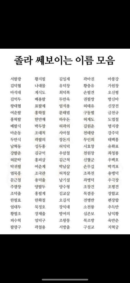 [유머]졸라 쎄보이는 이름모음(택배시킬때 꿀팁) 작성자한남머리는 제가땁니다.|작성시간19.05.06|조회수10,429 목록 댓글 51 글자크기 작게가 글자크기 크게가 그래도 내기준 곽두팔이 제일쩌는듯ㅋㅋㄱㅋㅋㅋㅋㅋㅋㅋㅋㅋㄱㅋㅋㅋㅋ 다음검색 현재 게시글 추가 기능 열기 북마크 공유하기 신고 센터로 신고 댓글 댓글 51 댓글쓰기 답글쓰기 댓글 리스트 작성자수원한시백 | 작성시간 19.05.06 조대척 김규척 척자들어간게 현실감있고 쎄보이네ㅋㅋㅋㅋ 작성자최수빈여자친구 | 작성시간 19.05.06 홍피살 김교살ㅋㅋㅋㅋㅋㅋㅋ 작성자아졸령졸려 | 작성시간 19.05.06 ㅅㅂ 추득만 ㅋㅋㅋㅋㅋㅋㅋㅋ 작성자Griffin Lehends | 작성시간 19.05.06 나대물ㅋㅋㅋㅋㅋㅋㅋㅋㅋㅋㅋㅋㅋㅋ 작성자추억보따리 | 작성시간 19.05.07 천태랑 댓글 전체보기