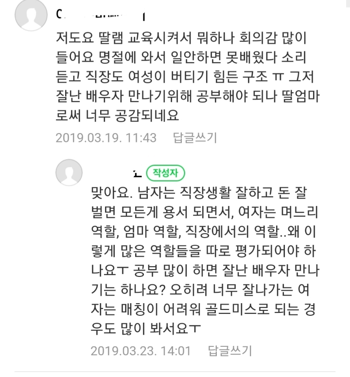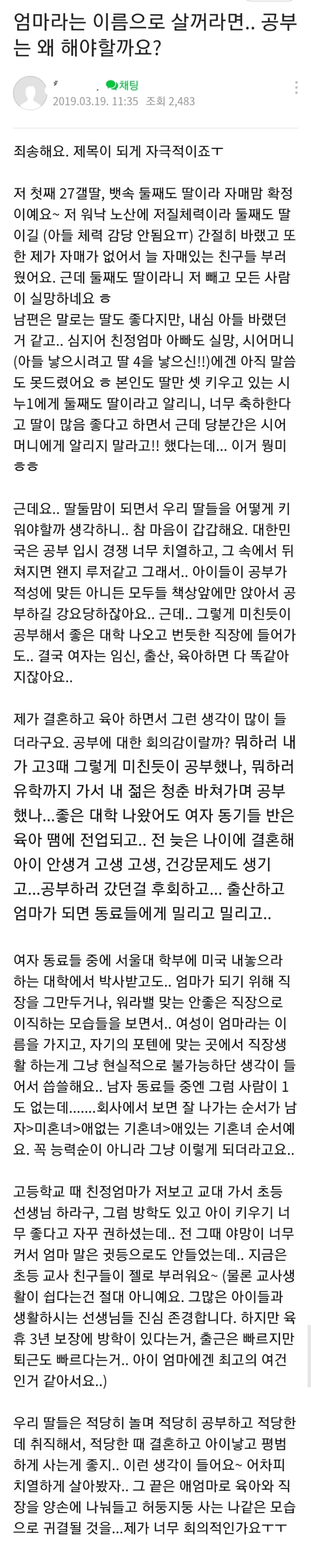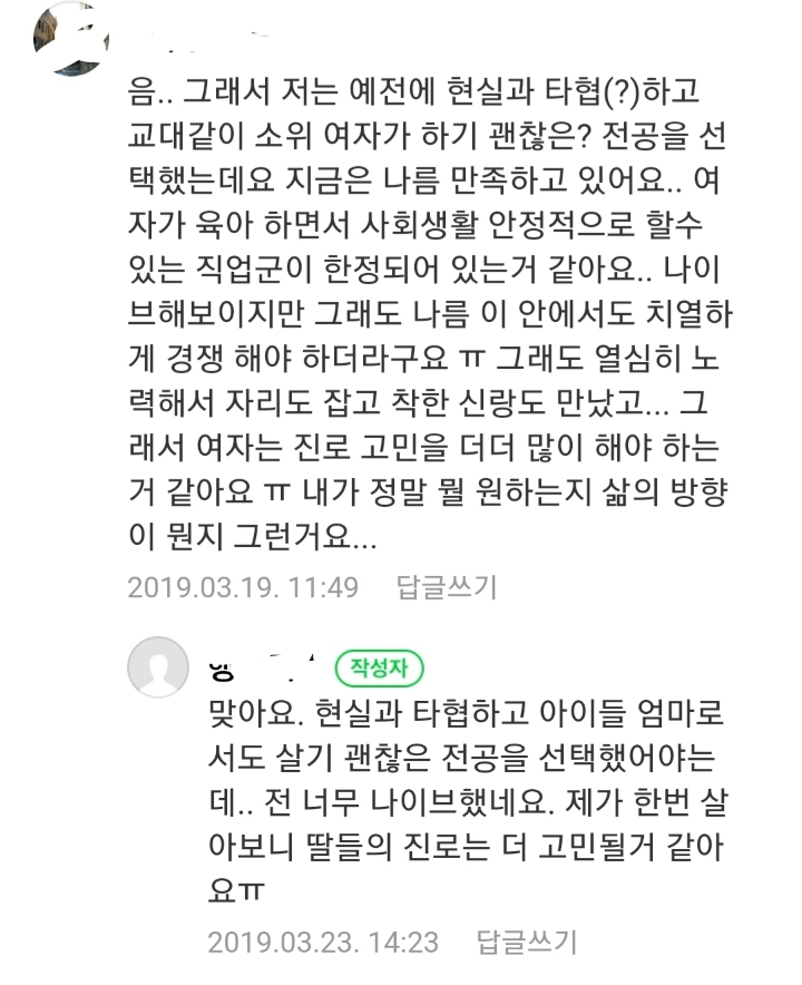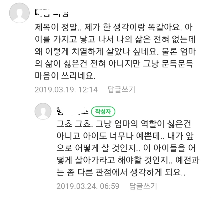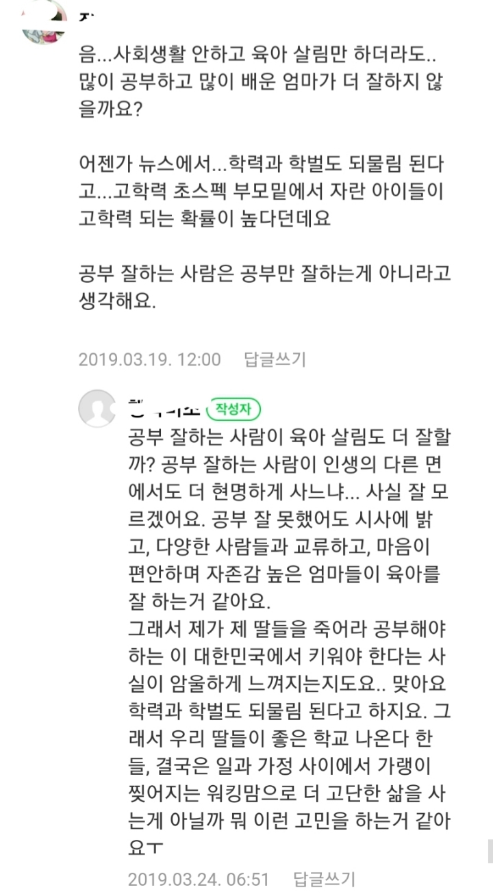 [스크랩] [기타]엄마라는 이름으로 살거라면.. 공부는 왜 해야할까요? 작성자최소공배수|작성시간19.05.19|조회수1,000 목록 댓글 2 글자크기 작게가 글자크기 크게가 출처 :https://m.cafe.naver.com/mapomommy/660332..... 다음검색 스크랩 원문 : *여성시대* 차분한 20대들의 알흠다운 공간 현재 게시글 추가 기능 열기 북마크 공유하기 신고 센터로 신고 댓글 댓글 2 댓글쓰기 답글쓰기 댓글 리스트 삭제된 댓글입니다. 답댓글 작성자해장라면 | 작성시간 19.05.19 와진짜 그렇네 댓글 전체보기