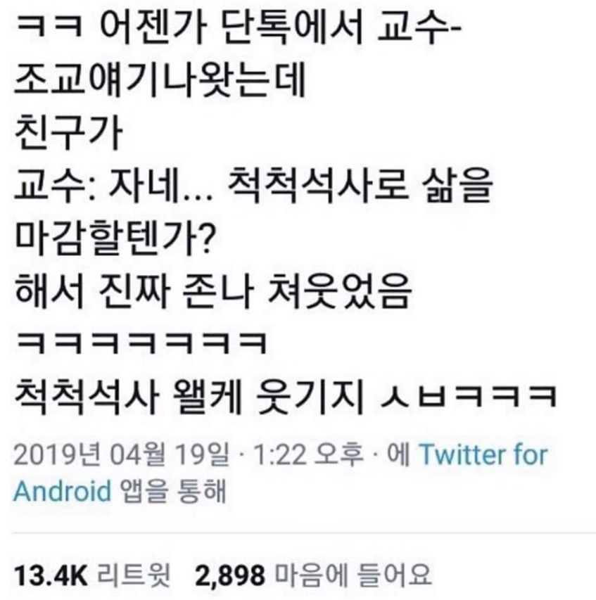 [스크랩] [유머]자네.. 척척석사로 삶을 마감할텐가? 작성자메키니키피키|작성시간19.06.02|조회수7,498 목록 댓글 19 글자크기 작게가 글자크기 크게가 출처 : 여성시대 apaisant 다음검색 스크랩 원문 : *여성시대* 차분한 20대들의 알흠다운 공간 현재 게시글 추가 기능 열기 북마크 공유하기 신고 센터로 신고 댓글 댓글 19 댓글쓰기 답글쓰기 댓글 리스트 작성자오됴요요오요 | 작성시간 19.06.02 착찹학사는 안되나요 작성자l2월32일. | 작성시간 19.06.02 척척학사도 어렵슴다.... 작성자하물현만상두 | 작성시간 19.06.02 척척학사만 되도 다행이에여.. 작성자눈깔파버리기전에간수잘해라 | 작성시간 19.06.02 ㅋㅋㅋㅋㅋㅋㅋ귀얍 ㅠㅠ 답댓글 작성자눈깔파버리기전에간수잘해라 | 작성시간 19.06.02 나 학사구나;; 댓글 전체보기