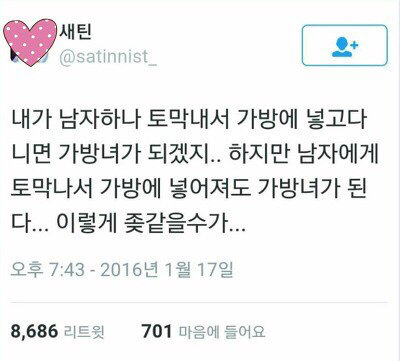 [스크랩] [판&톡]님들 그 가방녀 아세요??? 작성자Take My Hands Now|작성시간19.06.07|조회수7,598 목록 댓글 1 글자크기 작게가 글자크기 크게가 https://m.pann.nate.com/talk/341163625?currMenu=best&stndDt=2018024 다음검색 스크랩 원문 : 쭉빵카페 현재 게시글 추가 기능 열기 북마크 공유하기 신고 센터로 신고 댓글 댓글 1 댓글쓰기 답글쓰기 댓글 리스트 작성자밥브다고 | 작성시간 19.06.07 환멸남ㅋㅋㅋㅋㅋ피해자여도 가해자야도 언제나 여자한테만 포커스 댓글 전체보기