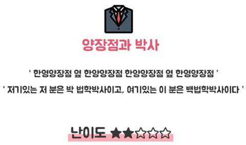 답댓글 작성자성좌, 은밀한 모략가 작성시간 19.06.17 한영 양장점 옆에 한양양장점 한양양장점 한영 양장점 저기 있는 저분은 박법학박사이고 여기 있는 이분은 100 법학박사이다