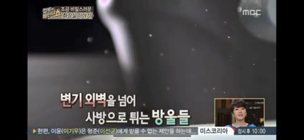 MBC 컬투의 베란다쇼에서 실험한 결과 화장실 바닥, 벽, 세면대, 거울, 화장실에 놓은 물건들에까지 다 튀었고 유튜브에서도 같은 결과를 보이는 다른 비슷한 실험 영상이 많음