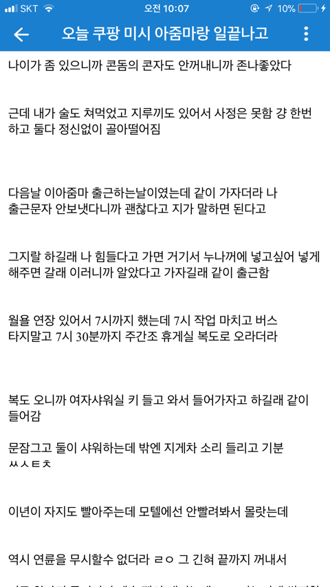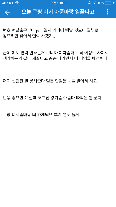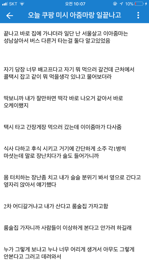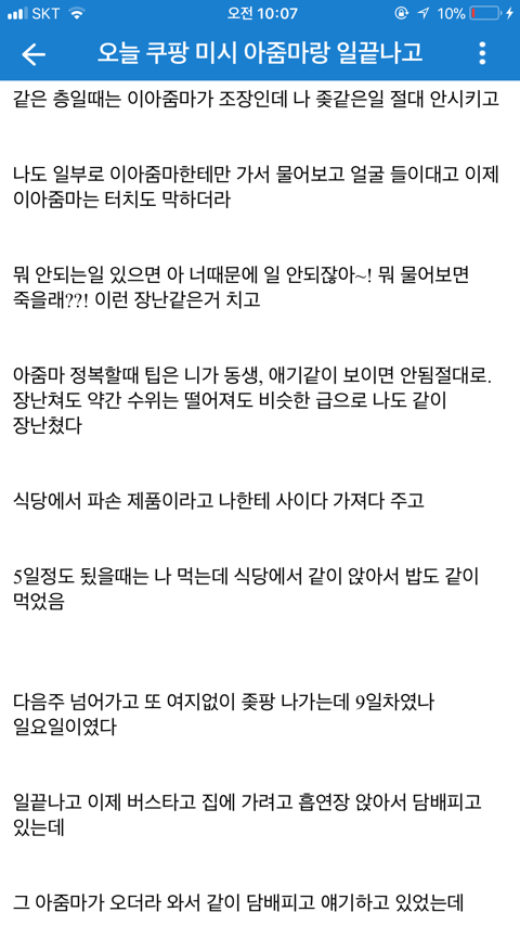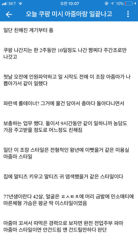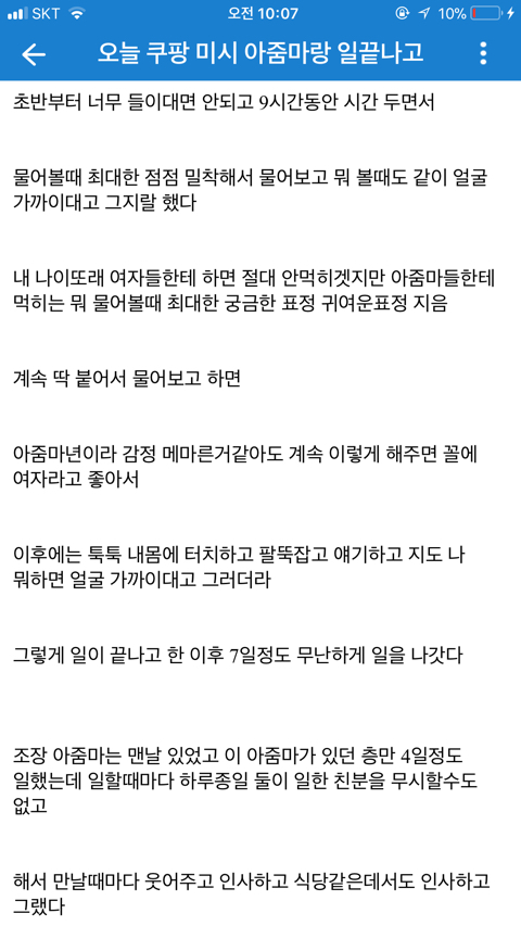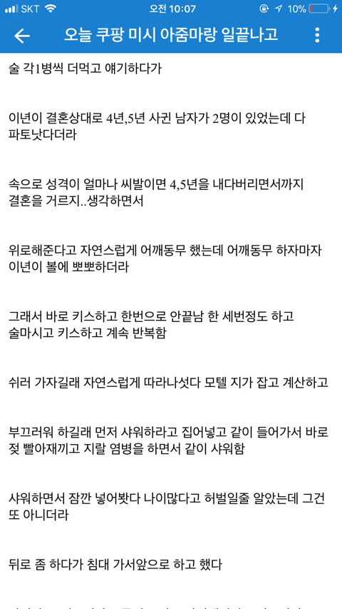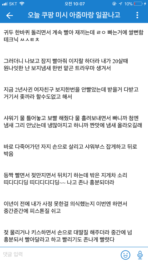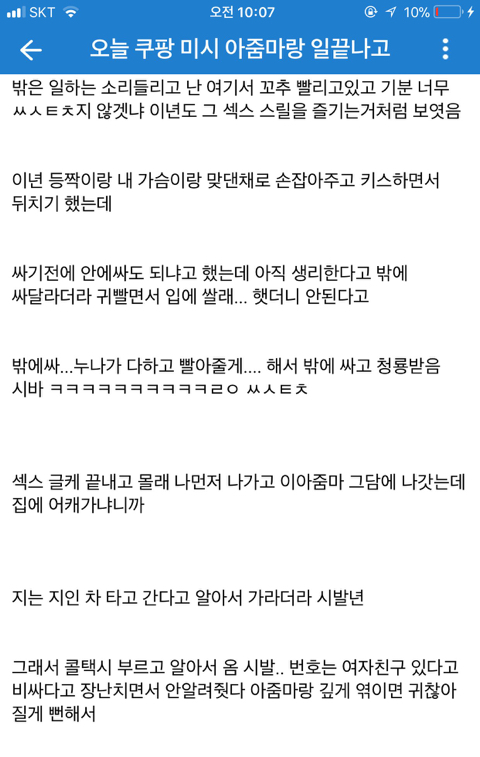 [기타]쿠팡 아줌마랑 한 썰 작성자normal a|작성시간19.08.12|조회수72,615 목록 댓글 60 글자크기 작게가 글자크기 크게가 문제시 글삭 다음검색 현재 게시글 추가 기능 열기 북마크 공유하기 신고 센터로 신고 댓글 댓글 60 댓글쓰기 답글쓰기 댓글 리스트 작성자제리 쩰리 | 작성시간 19.08.12 ㅋㅋㅋㅋ 존나웃곀ㅋㅋㅋㅋㅋㅋㅋ 정신승리 오지네 ㅋㅋ 작성자다부질없어 알지 | 작성시간 19.08.12 ㅋㅋㅋㅋㅋㅋㅋㅋㅋㅋㅋㅋㅋㅋㅋㅋ먹버 ㅉㅉ 작성자재기복숭아 | 작성시간 19.08.12 ㅅㅂㅋㅋㅋㅋ그래 앞으로도 잘대줘 아줌만 좋았어^^ 작성자oceanfromtheblue | 작성시간 19.08.12 먹혔구만 ㅆㅂㄹㅋㅋㅌㅌㅋㅋ 작성자세상을 바꿔갈 빛이라는 걸 | 작성시간 19.08.12 엥 진수총각? 댓글 전체보기