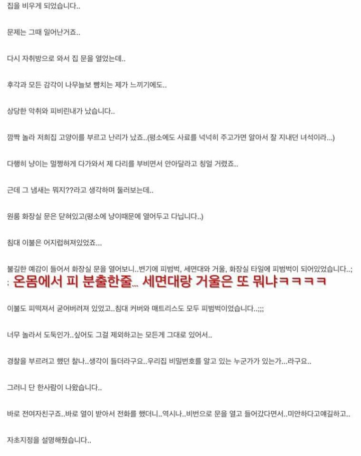 도대체 어떻게 해야 온 집안에 피 비린내가 나고 거울에 피범벅이 되는 건데ㅋㅋㅋㅋㅋㅋㅋㅋㅋㅋㅋㅋㅋㅋㅋㅋㅋ 여혐하기 위해 주작도 망설임 없이 하는 오윾이ㅋㅋㅋㅋㅋㅋㅋㅋㅋㅋㅋㅋㅋㅋㅋㅋㅋㅋㅋㅋㅋ