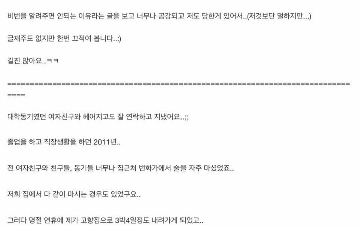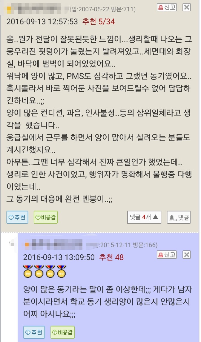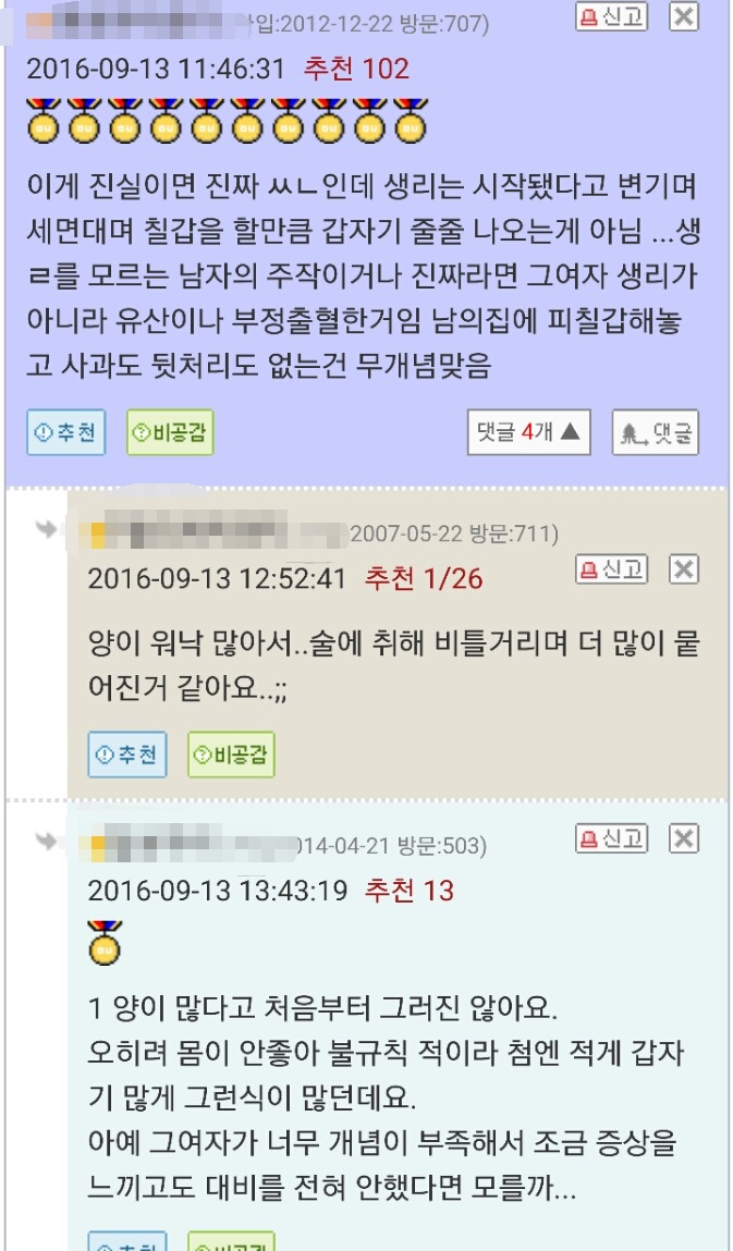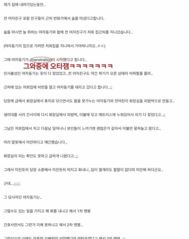 요약 : 전 여친이 오윾이의 집 비밀번호를 알고 있었음. 어느 날 전 여친이 친구들과 함께 술 마시며 노는데 친구 중 한 명이 생리를 시작함. 어찌할 바를 모르던 전 여친이 오윾이의 집에 무단침입. 생리 첫 날인데 온 집안에 '상당한 악취와 피 비린내가 날 정도로' 피칠갑을 해놓고 도망감.