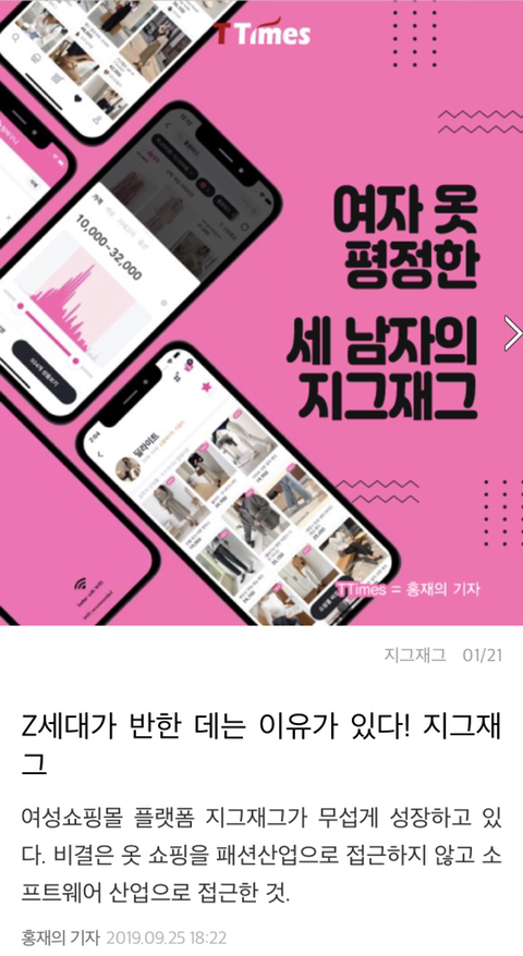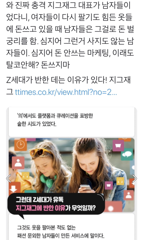[스크랩] [기타]쇼핑어플 ‘지그재그’의 대표는 남자 세 명이었음_twt 작성자오종종|작성시간19.09.27|조회수17,533 목록 댓글 133 글자크기 작게가 글자크기 크게가 출처 : https://twitter.com/dontmarryatall/status/1177122208596078592?s=21 / http://www.ttimes.co.kr/view.html?no=2019092415127778891&ref=tw&shlink=tw마케팅에 돈도 안 씀.....이거보고 예전에 받아논거 바로 삭제함충격이야..+첨보는 쇼핑몰인데 이것도 마찬가진가봐 다음검색 스크랩 원문 : *여성시대* 차분한 20대들의 알흠다운 공간 현재 게시글 추가 기능 열기 북마크 공유하기 신고 센터로 신고 댓글 댓글 133 댓글쓰기 답글쓰기 댓글 리스트 작성자머잖아 저 분홍빛 차차 없어져서는 | 작성시간 19.09.27 아 씨 미친 지금도 보고 있었는데 작성자민성이처돌이 | 작성시간 19.09.27 으아아악 작성자클라라진정해 | 작성시간 19.09.27 바로 삭제함 ㅡㅡ 작성자Kim Hyunbin | 작성시간 19.09.28 에휴 작성자민슈가슈가륜 | 작성시간 19.12.16 룩핀이랑 스타일썸 ㄱ 댓글 전체보기