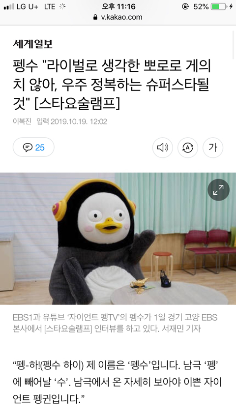 “EBS에 유명한 펭귄이 있지 않습니까. 뽀로로라고. 뽀로로 선배님을 보고 한국에 가면 나도 스타가 될 수 있을 것 같아서 한국에 왔습니다. 처음에는 뽀로로 선배님을 라이벌이라고 생각했는데, 이제는 (뽀로로 선배와) 이기고 지는 것에 의미를 두지 않습니다. 지금은 나 자신과의 싸움이죠!”