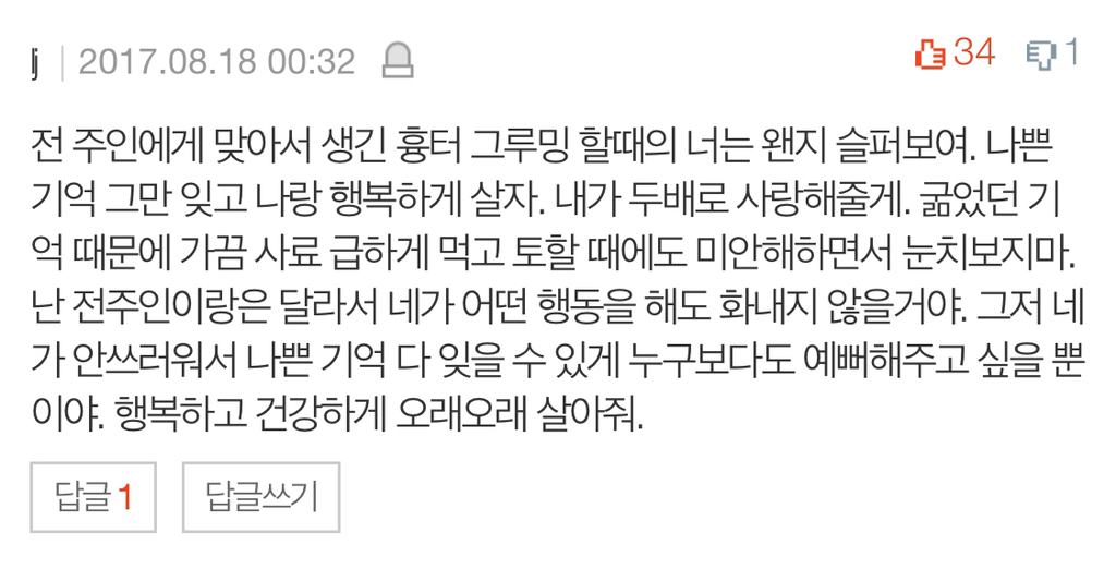 작성자Aphex twin 작성시간 19.10.21 강아지긴한데 나리야 니가 조금이라도 어렸을 때 더 많이 돌아다닐걸 강아지 놀이터 한 번도 못가보고 누나 재미없지 보고싶어 맨날 가끔만 가서 미안해 나리야 혹시 훗날 떠날 때 내가 본집에 있을때 떠나줬으면 해 이거 하나만 들어줘 나랑 살면서 불행하진 않니? 행복한지도 궁금해 나는 나리가 제일 좋아 늘 사랑하고 너가 제일 예쁘고 내 인생 최고의 친구야 우리 앞으로도 더 많이 행복하게 지내자 내가 관리도 완벽하게 못해주는데 건강해줘서 너무 고마워 혹시 아프면 꿈에라도 나와서 꼭 말해줘 어디 아프다고
