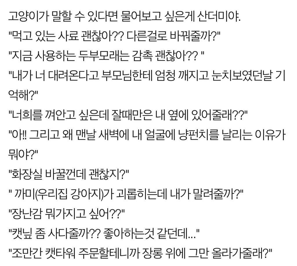 작성자사장님월급줘요 작성시간 19.10.20 너 이갈이 중인데 사료 씹기 안 불편해? 안 아픈 거야? 내가 놀아준다고 놀아주는데 혹시 외롭지는 않아? 내 다리 사이에 들어가서 다리에 몸 붙이고 자는 건 왜 그러는 거야? 그게 좋아? 지금 사료 말고 곧 바꿔줄 건데 괜찮아? 그리고 어디 아픈 데 없어? 아프면 꼭 어떻게든 울어줘 우리 주인님 사랑해