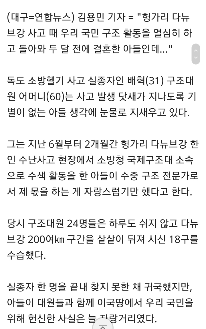 [기사]"헝가리 다뉴브강서 돌아와 결혼한 지 겨우 두 달이 지났는데…" 작성자뱅쇼만들기|작성시간19.11.05|조회수5,781 목록 댓글 9 글자크기 작게가 글자크기 크게가 기사전문 ㅡ https://m.news.nate.com/view/20191105n39285 다음검색 현재 게시글 추가 기능 열기 북마크 공유하기 신고 센터로 신고 댓글 댓글 9 댓글쓰기 답글쓰기 댓글 리스트 작성자콬아콜라 | 작성시간 19.11.05 진짜 마음아프다... 작성자Wavy colde | 작성시간 19.11.05 와 진짜 사람 일이란게 참 슬프다...... 작성자한라동호두과자 | 작성시간 19.11.05 진짜 마음 아파...... 국민 안전을 위해 누구보다 헌신하는 분들인데.....ㅠ 작성자호잇호잇호빗 | 작성시간 19.11.05 마음 아프다......ㅠㅠ 작성자지오콘 | 작성시간 19.11.05 ㅜㅜ 돌아오세요... 댓글 전체보기