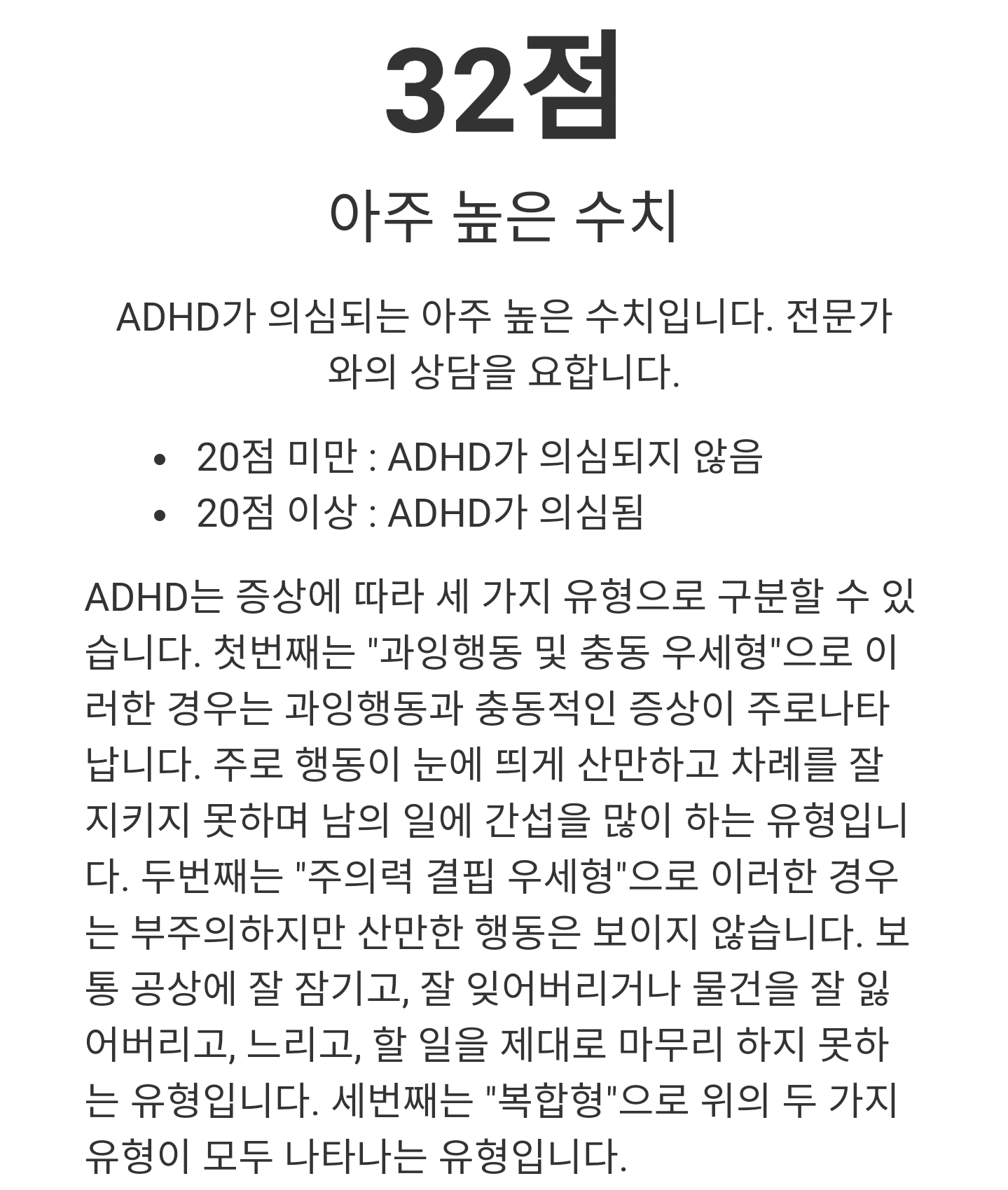 [스크랩] [기타]성인 adhd 검사 작성자비티이일 망이|작성시간19.11.24|조회수7,201 목록 댓글 68 글자크기 작게가 글자크기 크게가 미방http://testharo.com/adhd/가볍게 해보자....!근데 난 저거 테스트해보고 병원가니깐 성인 adhd 판정받았음ㅋㅋ문제시 쫀득초코칩 먹음 다음검색 스크랩 원문 : 쭉빵카페 현재 게시글 추가 기능 열기 북마크 공유하기 신고 센터로 신고 댓글 댓글 68 댓글쓰기 답글쓰기 댓글 리스트 작성자Action!(Feat.GRAY) | 작성시간 19.11.25 나 49점인데 병원가봐야하나...? 이미지 확대 답댓글 작성자Action!(Feat.GRAY) | 작성시간 19.11.25 나보다 높은사람이없네...ㅎ 작성자어지러운 이 세상에 내가 숨 쉰 이유 | 작성시간 19.11.25 나 29점.. 작성자당신과 함께라면 오래도록 | 작성시간 19.11.25 27... 작성자이가턴턴 | 작성시간 19.11.25 14점 이미지 확대 댓글 전체보기