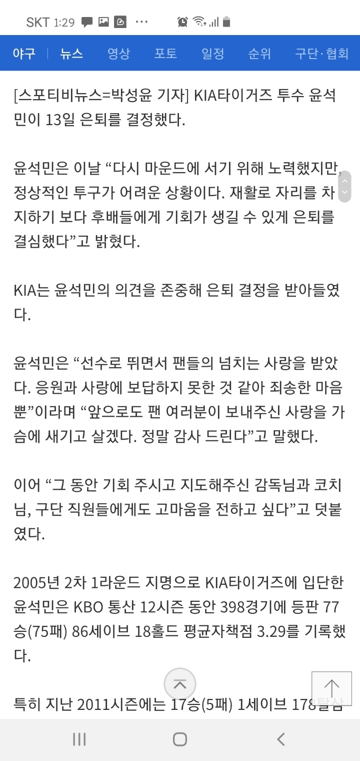 [기사][오피셜] KIA 윤석민 끝내 은퇴 결정 작성자모두 다 이루어질거야|작성시간19.12.13|조회수4,447 목록 댓글 24 글자크기 작게가 글자크기 크게가 https://m.sports.naver.com/news.nhn?oid=477&aid=0000222928 다음검색 현재 게시글 추가 기능 열기 북마크 공유하기 신고 센터로 신고 댓글 댓글 24 댓글쓰기 답글쓰기 댓글 리스트 작성자뜧쁗 | 작성시간 19.12.13 할 왜? 작성자빛을 향한 날개 | 작성시간 19.12.13 아 진짜 마음 심란해 안타깝다.. 작성자SKT T1 배성웅 | 작성시간 19.12.13 이래서 ㅠ 미국가는것도 별로 안반겨 작성자기아싸이거스 | 작성시간 19.12.13 석민아 고생했다.. 작성자야구 노관심 | 작성시간 19.12.13 와....ㅠㅠㅜㅜ 마음 아프다... 댓글 전체보기