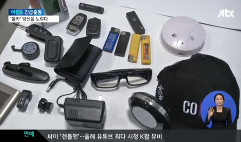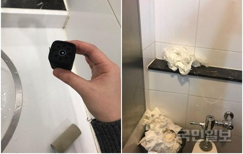 다쓴 휴지곽, 뭉쳐진 휴지더미, 변기통 안, 쓰레기통, 천장, 바닥 등 카메라를 숨기는 방법이 가지각색이야. 위 사진은 실제로 발견된 불법카메라라고해.