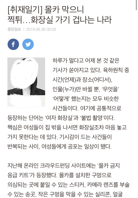 한달에 한 번씩은 화장실 몰카(불법촬영)에대해 기사가 올라오고 있어.