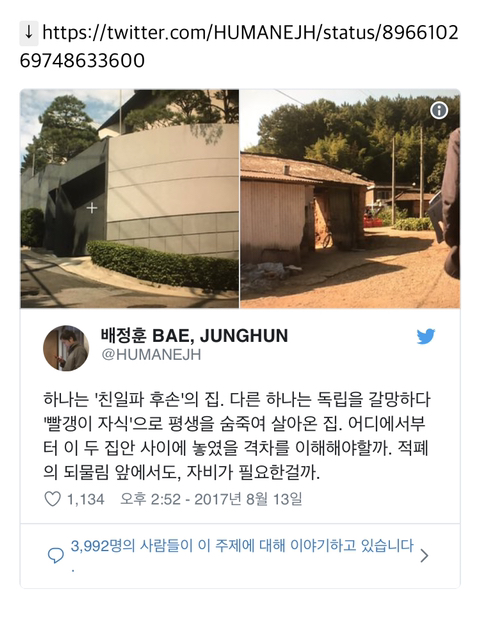 [스크랩] [기타]그알 PD가 올린 친일파후손의 집과 독립투사 후손의 집 작성자1년동안 억울활중 3번|작성시간20.01.19|조회수6,948 목록 댓글 11 글자크기 작게가 글자크기 크게가 출처 : https://theqoo.net/index.php?mid=square&filter_mode=normal&page=3&document_srl=541850968친일파 후손 집독립투사의 집진짜 개조팔 친일파들 재산 싹다 몰수해야함ㅡㅡ 다음검색 스크랩 원문 : *여성시대* 차분한 20대들의 알흠다운 공간 현재 게시글 추가 기능 열기 북마크 공유하기 신고 센터로 신고 댓글 댓글 11 댓글쓰기 답글쓰기 댓글 리스트 작성자서로 좋아죽는 바보 | 작성시간 20.01.19 시발 작성자어흥호랑님 | 작성시간 20.01.19 눈물나ㅠㅠ 작성자와랄랄라왈라비 | 작성시간 20.01.19 좆같다 작성자마이무요 | 작성시간 20.01.19 친일파 진짜 바로 다 청산됐어야했어... ㅂㄷㅂㄷ 작성자Very | 작성시간 20.01.22 ㅜㅜ 댓글 전체보기
