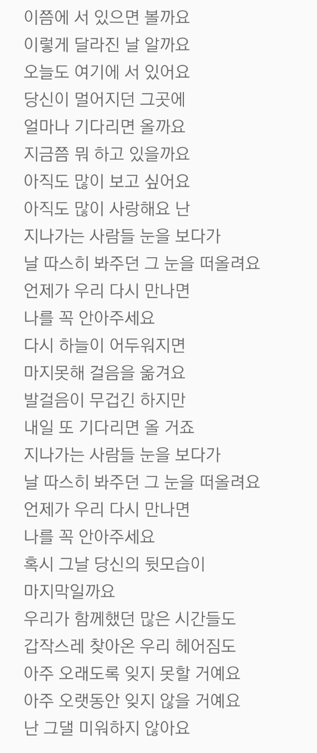 "오늘도 어딘가에서 주인을 기다릴 유기견들이 너무 많다. 아이들은 사랑받던 시간이 무색하게 도무지 이해할 수 없는 이유로 버려졌을 것이다. 그리고 하염없이 기다릴 것이다. 아이를 버렸거나, 단 한 순간이라도 그런 마음을 먹었던 사람들이 이 노래를 듣는다면, 후회했으면 한다. 본인들의 잘못에 아파하고 다시는 그런 일이 없도록. 더이상 아이들이 버려지지 않았으면 좋겠다.."
