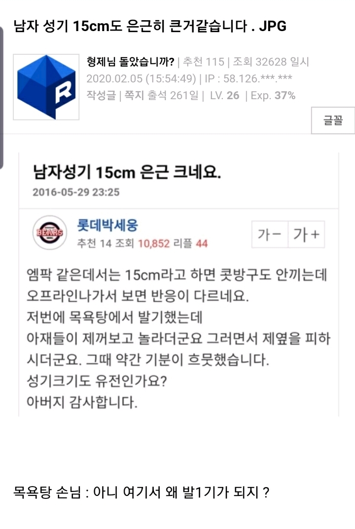 [기타]남자 성기 15센치도 은근히 큰 것 같습니다 작성자콜롴콜록|작성시간20.02.05|조회수16,645 목록 댓글 21 글자크기 작게가 글자크기 크게가 미방그날따라..궁둥이가 아름다운 남성분들이 많았나봅니다.. ^^...부럽내여출처 에펨 ㄹㄹㅇ 다음검색 현재 게시글 추가 기능 열기 북마크 공유하기 신고 센터로 신고 댓글 댓글 21 댓글쓰기 답글쓰기 댓글 리스트 작성자공부는 참 재밌다 | 작성시간 20.02.05 하 난 17은 되어야해.. 그이하는 양보못함 ㅅㅂ 작성자널 갈아서 마셔준다 | 작성시간 20.02.05 목욕탕에서 발기하니까 사람들이 놀라지.. 저 대가리 텅텅은 뭐지 진짜 작성자달보단별이좋아 | 작성시간 20.02.05 암만커도 한남이랑 섹스안혀요~ 작성자우한남아웃 | 작성시간 20.02.05 미방.... 작성자리코스이키 | 작성시간 20.02.05 미친놈이라 놀래서 쳐다본거아니야? 댓글 전체보기