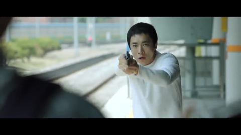 역에 잠복해있던 신입 경찰 정민(김영민)이 덜덜 떨면서 총을 겨누고 있음