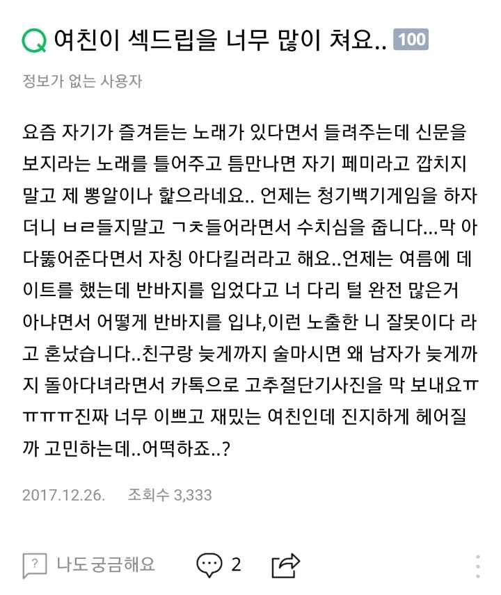 [기타]여친이 섹드립을 너무 많이 쳐서 힘들다는 남자~쭉탁스 형님들이 보긴 어떠신가요ㅋ 작성자하이루방가방가.|작성시간20.02.14|조회수10,426 목록 댓글 27 글자크기 작게가 글자크기 크게가 제가 보긴..연인사이에 그냥 웃기려고 장난치는 것 같고 너무 심각하게 반응하네요..센스있게 받아칠 생각을 해야지ㅋㅋ저렇게 보수적이고 재미없는 남자..저라면 안 만납니다ㅎ쭉탁스 형님들 생각은 어떠신지? 다음검색 현재 게시글 추가 기능 열기 북마크 공유하기 신고 센터로 신고 댓글 댓글 27 댓글쓰기 답글쓰기 댓글 리스트 작성자왕천재 | 작성시간 20.02.14 ㄱㅇㄱㅋㅋㅋㅋㅋㅋㅋㅋㅋㅋㅋ 작성자우야웅어우웅 | 작성시간 20.02.14 즐기는듯 ㅋㅋ 작성자간식러버 | 작성시간 20.02.14 귀여워 작성자미루나무호두마루 | 작성시간 20.02.15 ㅈㄴ웃기다 작성자아나고 | 작성시간 20.02.15 ㅋㅋ여자가 유머감각을 키워야하는 이유! 댓글 전체보기